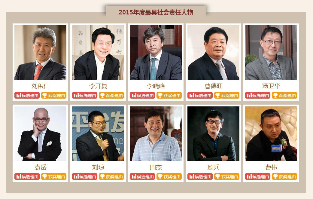 《互联网周刊》2015年度人物以“诚”的本质作为评价原则,,,以各行各业的共性与特性作为认知和解析角度,,,以普世的精神和信念作为基本价值尺度,,,最终评选出100位身处在当下互联网风暴中心的企业家。。。这些企业家身持续秉承着强大的企业愿景,,,植根于最具根本性的企业和社会责任,,,诚于内而信于外,,,以一个企业家、、、一个公民的良知、、、责任,,,为社会、、、行业树立了知行的榜样。。。